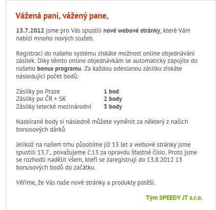 Nemáte-li již zájem nadále dostávat Speedy Kurýr Newsletter, můžete se ihned odhlásit. |